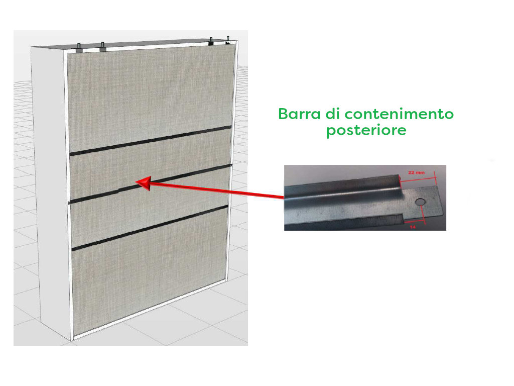 • Barra di contenimento retro schiena, in lamiera rinforzata sagomata a C, preforata (va montata a metà altezza nella parte posteriore della struttura)